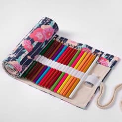 Deze canvas roletui is blauw/wit gestreept met kleurige rozen en is ideaal voor het opbergen van 72 potloden, pennen of stiften. Het etui rol je gemakkelijk op en zet je vast met de stijlvolle touwsluiting, zodat de potloden/pennen of stiften er niet uit kunnen vallen. Super handig om mee te nemen op reis, maar ook prettig in gebruik voor thuis.
